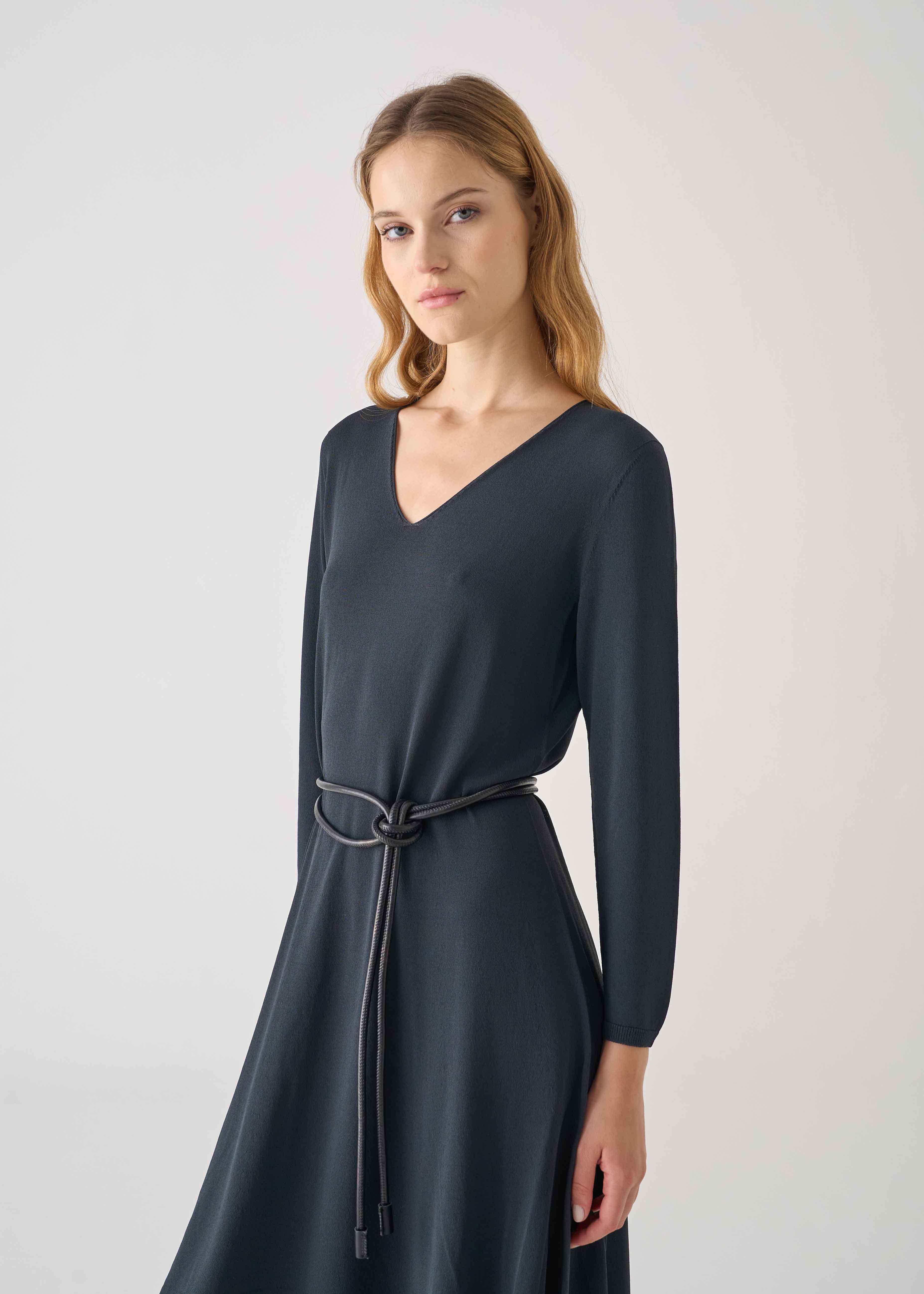 Abito lungo in maglia di viscosa con scollo V e maniche lunghe che donano raffinatezza al look. La fluidità della viscosa crea un drappeggio naturale che avvolge la figura con grazia e, se abbinato ad una cintura, permette di definire la vita e personalizzare la silhouette. Il tessuto leggero e fluido garantisce comfort e libertà di movimento, rendendo questo abito perfetto per ogni occasione, dal giorno alla sera. La lunghezza midi e il taglio femminile esprimono un’eleganza contemporanea, unendo la tradizione sartoriale italiana a un design moderno e versatile. Il capo è disegnato e prodotto in Italia. La cintura non è inclusa nel prezzo ed è stata utilizzata solo per lo styling. La modella indossa la taglia 42.