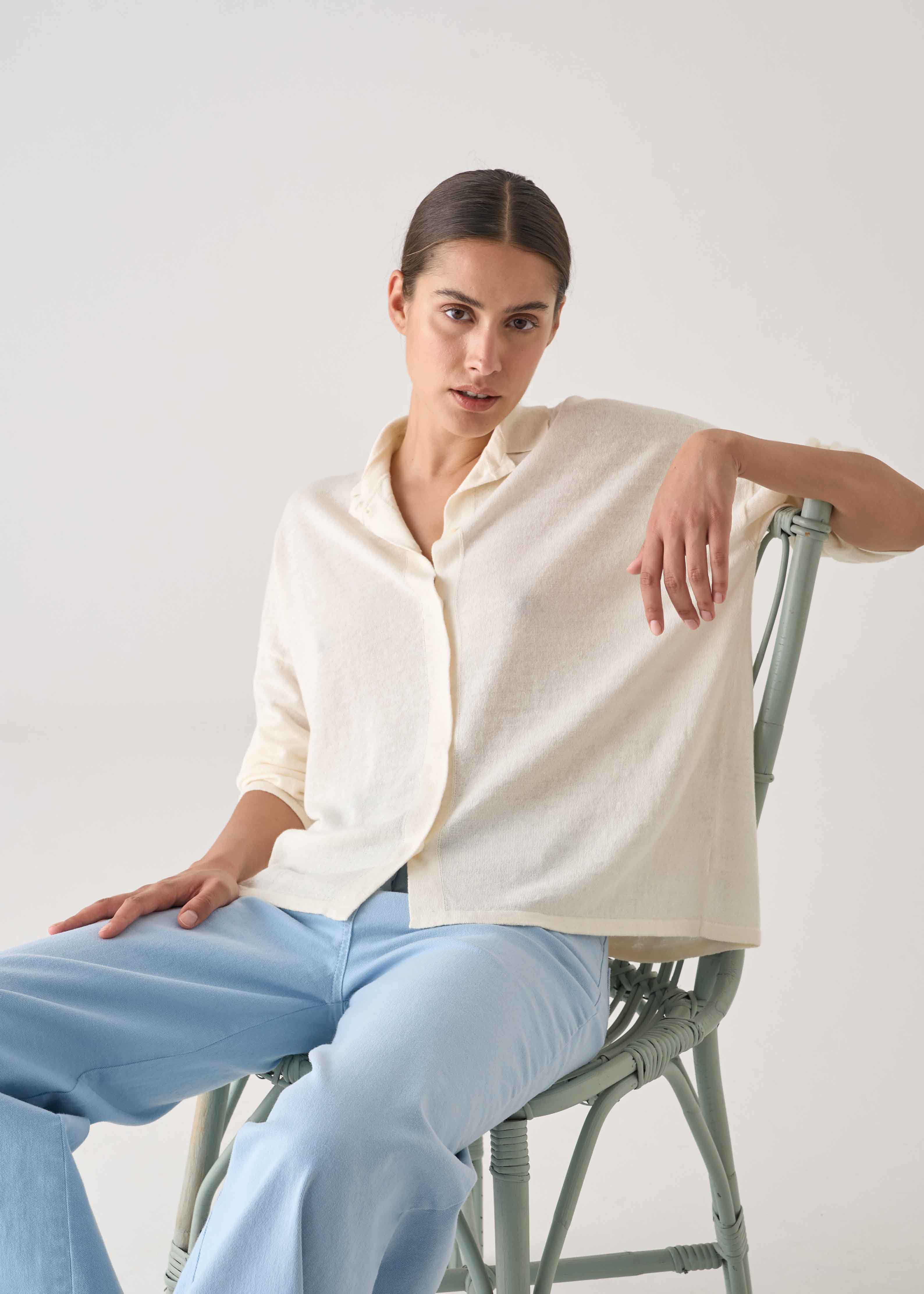 Camicia in maglia in lino e cotone bio con una mano soft, naturale e leggera. Il design è caratterizzato da linee fluide e una vestibilità morbida, ideale per ogni momento della giornata. Il colletto e i bottoni tono su tono donano un tocco casual, mentre il bordo tubolare aggiunge un dettaglio raffinato che valorizza la semplicità del capo. Le spalle scese e la costruzione a manica ampia accentuano il comfort del capo e la sua forte identità stilistica. La modella indossa la taglia 42.