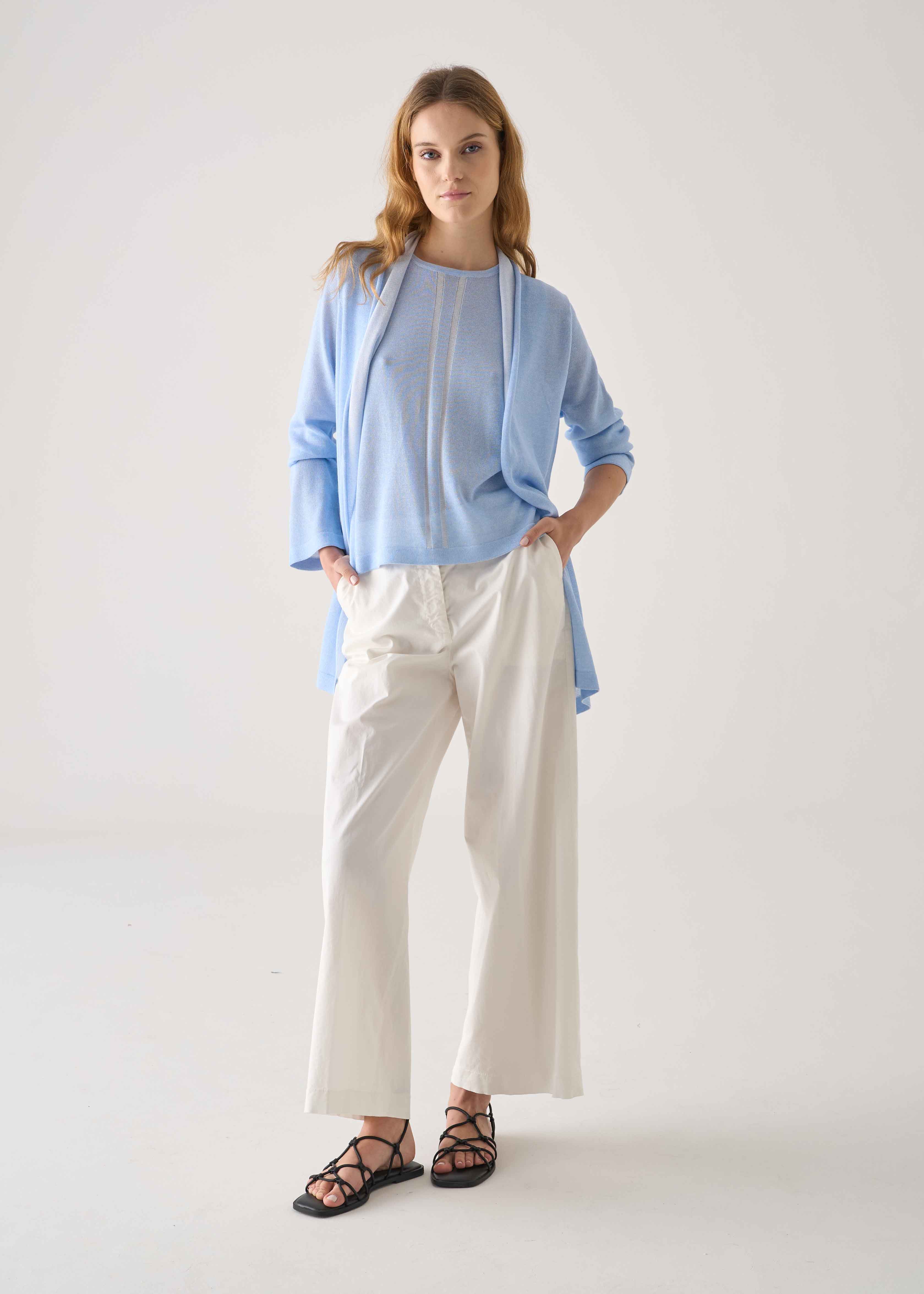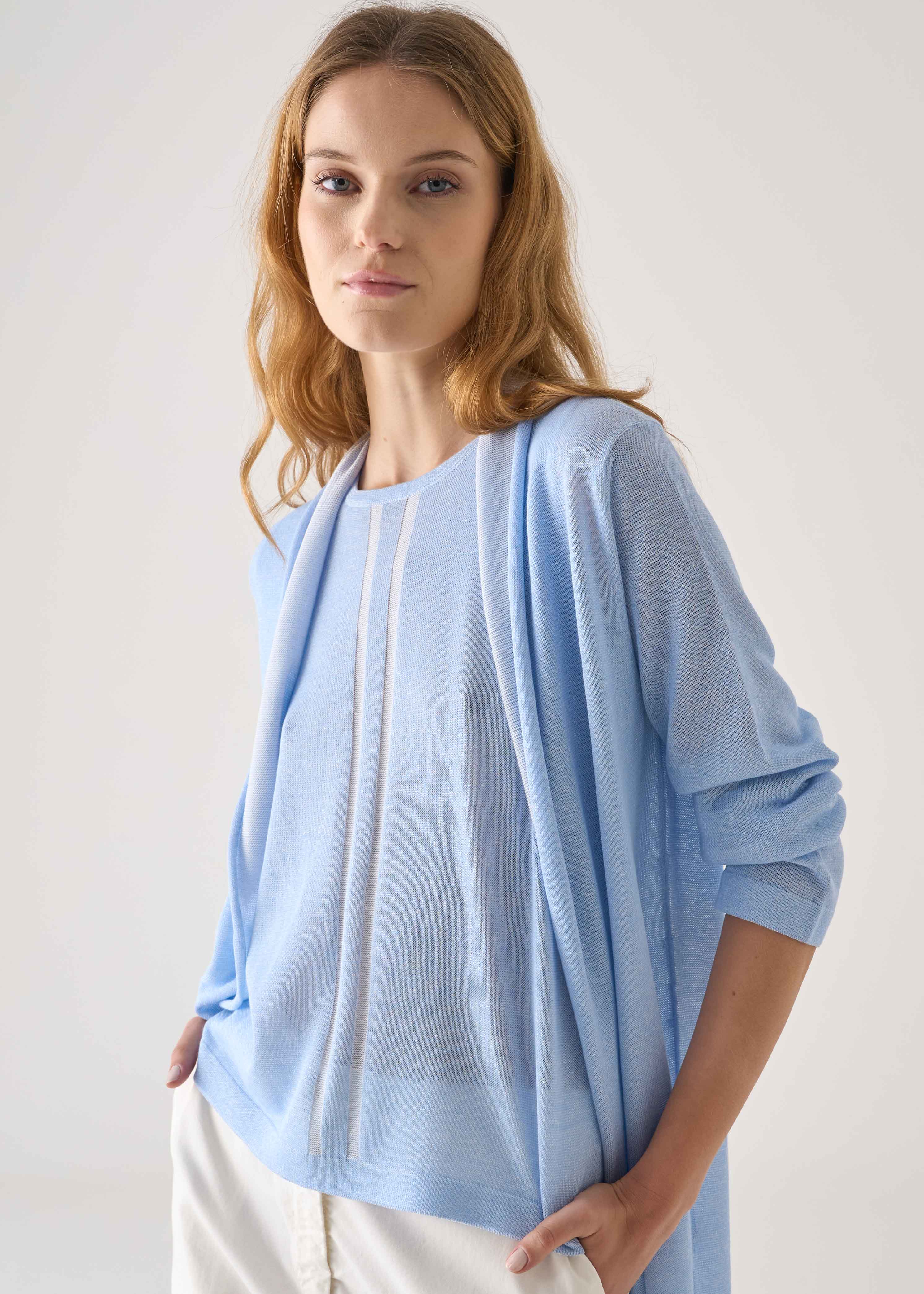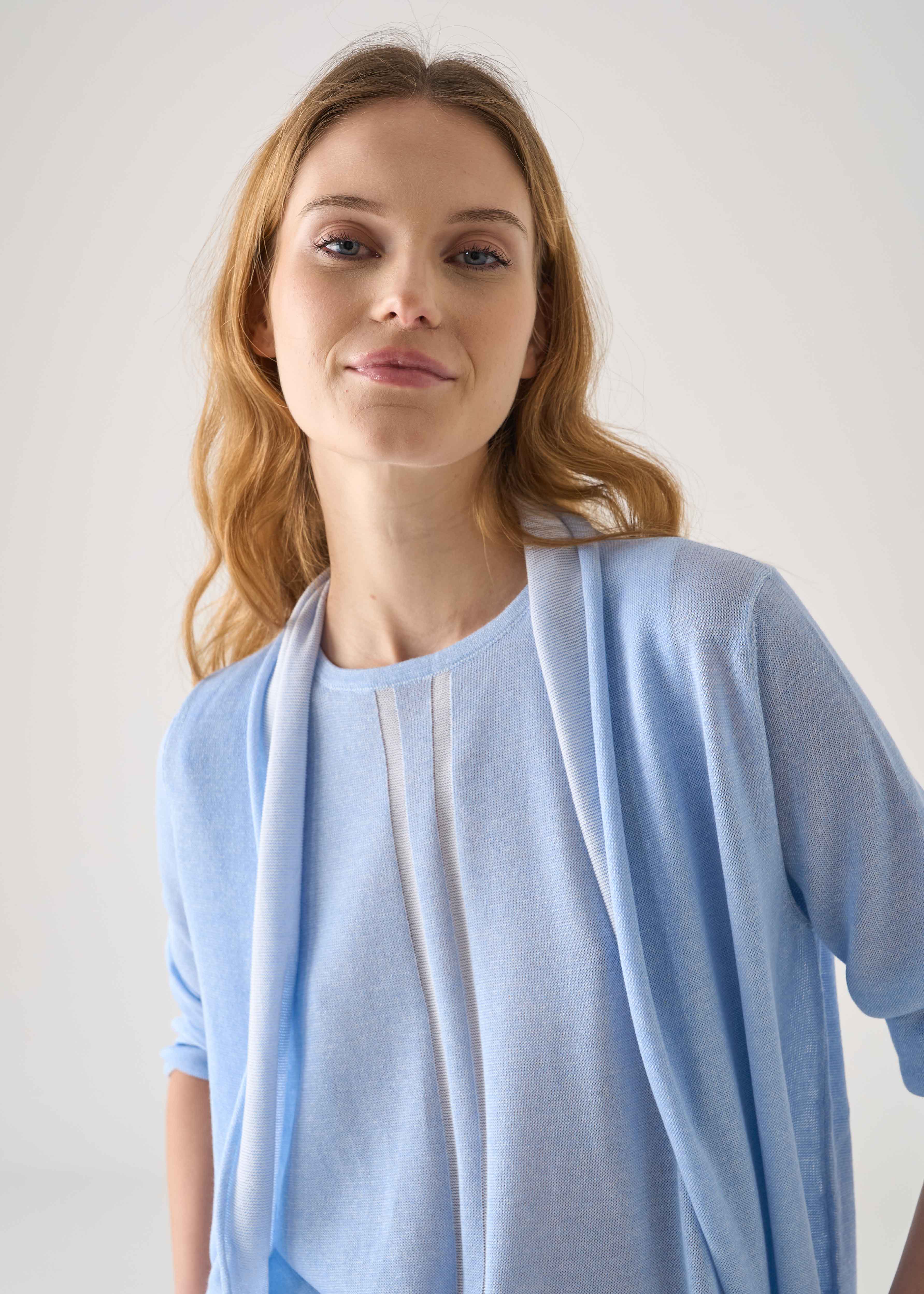 Cardigan in cotone e viscosa vanisè con bordo sciallato nella parte frontale che dona movimento e femminilità al capo. L’effetto vanisè crea una superficie morbida e piacevole al tatto, mentre i bordi tubolari sul fondo delle maniche e del capo completano il design con una finitura impeccabile e ricercata. Le maniche lunghe dalla linea fluida e il taglio confortevole rendono questo cardigan perfetto per essere indossato in ogni occasione, dal tempo libero agli appuntamenti più eleganti. Un capo versatile che unisce comfort e stile con discreta raffinatezza, disegnato e prodotto in Italia. La modella indossa la taglia 42.