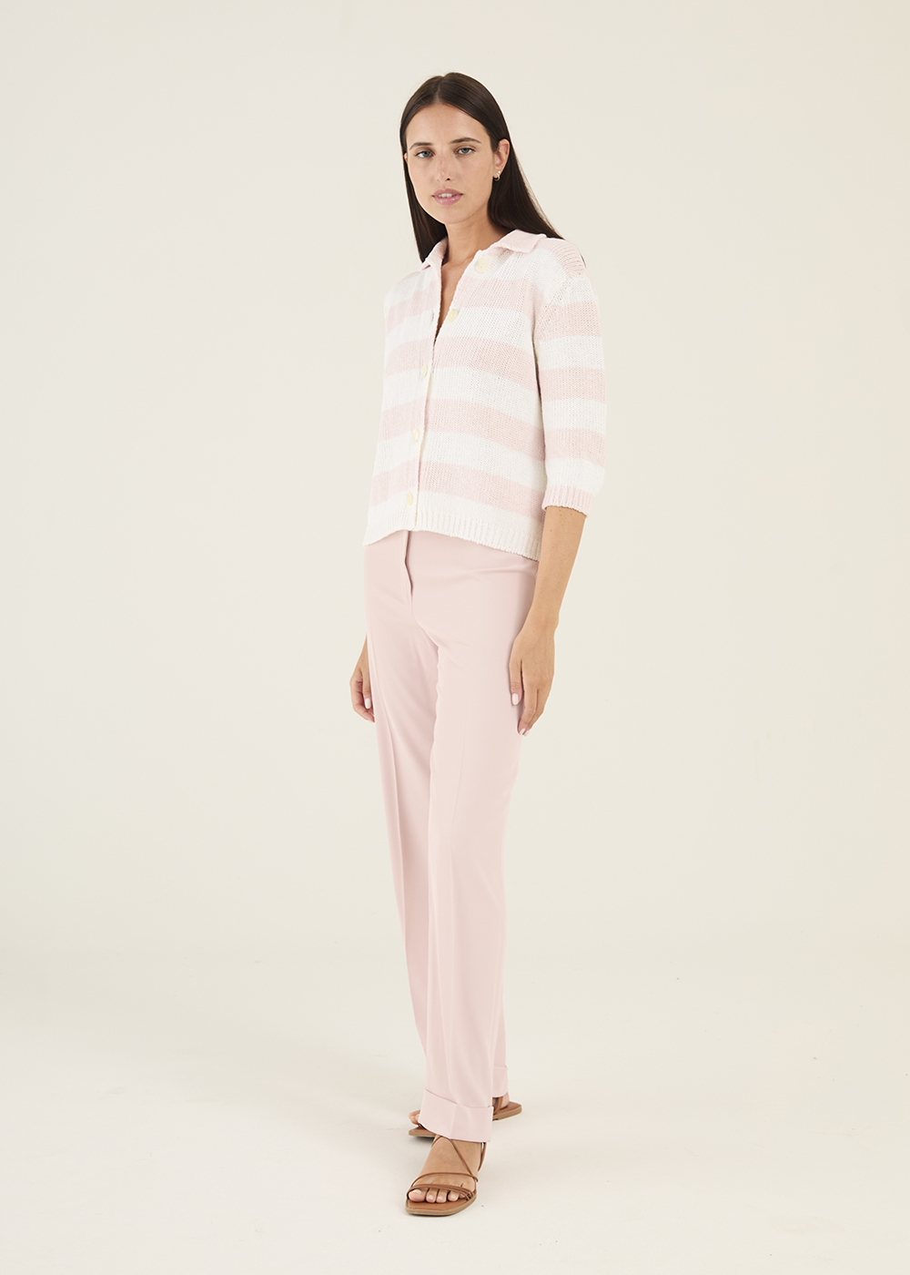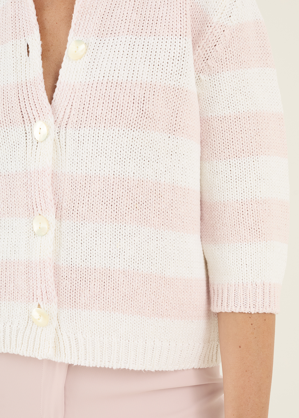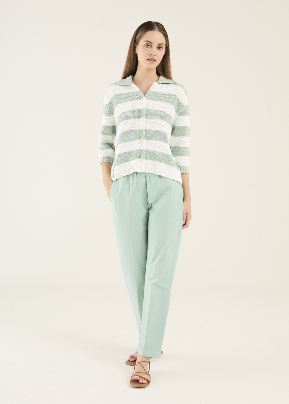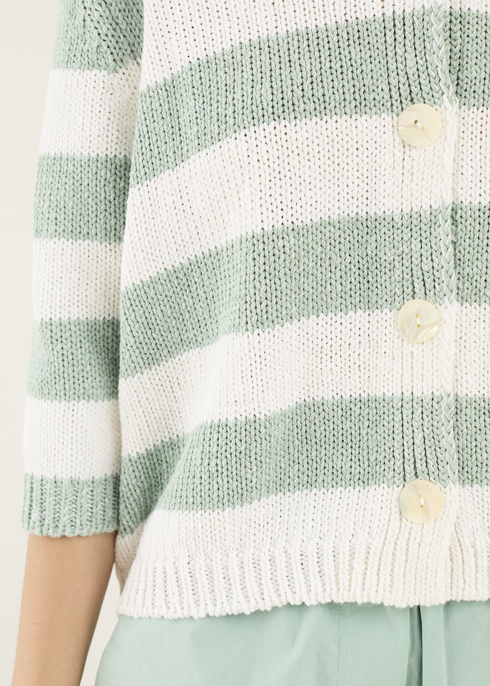 Cardigan rigato con colletto polo, realizzato in cotone-lino vanisè, che si distingue per la sua texture fresca e naturale, capace di accompagnare con delicatezza le giornate più luminose, lasciando respirare la pelle con una piacevole sensazione di comfort. La vestibilità dritta scivola lungo il corpo senza segnare, creando una linea fluida e disinvolta che valorizza ogni silhouette con naturalezza. Il colletto polo aggiunge un accento raffinato, mentre la chiusura con bottoni frontali scandisce il capo con semplicità ed equilibrio, rendendolo estremamente versatile. La fantasia rigata dona ritmo e dinamismo, trasformando il cardigan in un capo di carattere, capace di elevare anche i look più essenziali. Le maniche a tre quarti, leggere e pratiche, contribuiscono ad un’estetica estiva e sofisticata, mentre i bordi a coste, più sottili e discreti, rifiniscono il capo con eleganza senza appesantirne la linea. Un cardigan pensato per chi ama uno stile spontaneo e curato, disegnato e prodotto interamente in Italia, espressione raffinata del Made in Italy. La modella indossa la taglia 42.