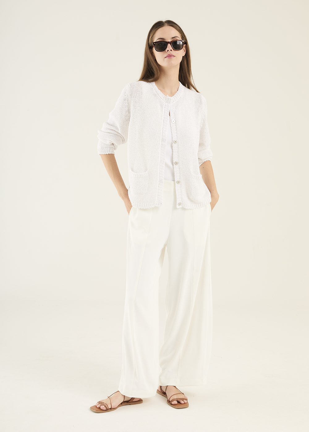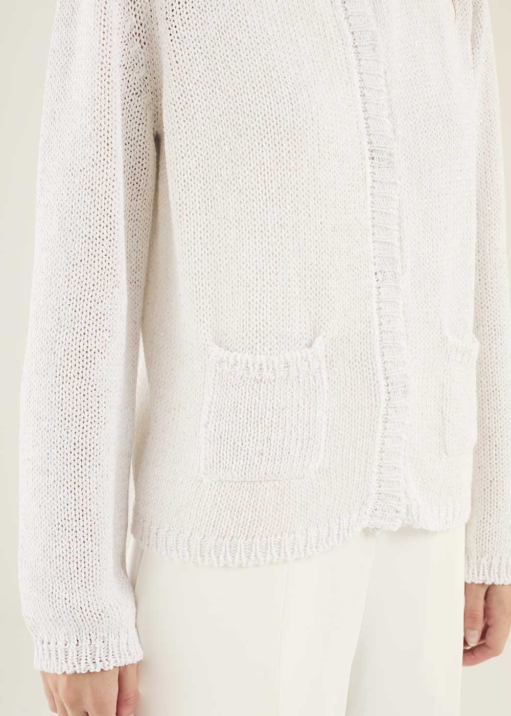 Chanel realizzata in cotone vanisè che si distingue per la sua texture leggera e luminosa, arricchita da paillettes discrete che catturano la luce in modo sofisticato, senza mai risultare eccessive. Il taglio classico definisce una silhouette pulita e senza tempo, il girocollo dona equilibrio e armonia al design. Le maniche lunghe completano il capo con eleganza, rendendolo perfetto per accompagnare con stile le diverse occasioni della giornata. A impreziosire ulteriormente la giacca sono le due taschine frontali, un dettaglio iconico che aggiunge carattere e ricercatezza, contribuendo a creare un’estetica curata in ogni particolare. La chiusura con automatici sul davanti mantiene la linea essenziale e pulita, mentre il bordo a coste rifinisce con precisione tutto il capo, incorniciandolo con una nota materica che ne esalta la struttura. Un capo pensato per chi ama distinguersi attraverso dettagli raffinati e mai ostentati. Disegnata e prodotta interamente in Italia, rappresenta l’eccellenza della maglieria Made in Italy. La modella indossa la taglia 42.