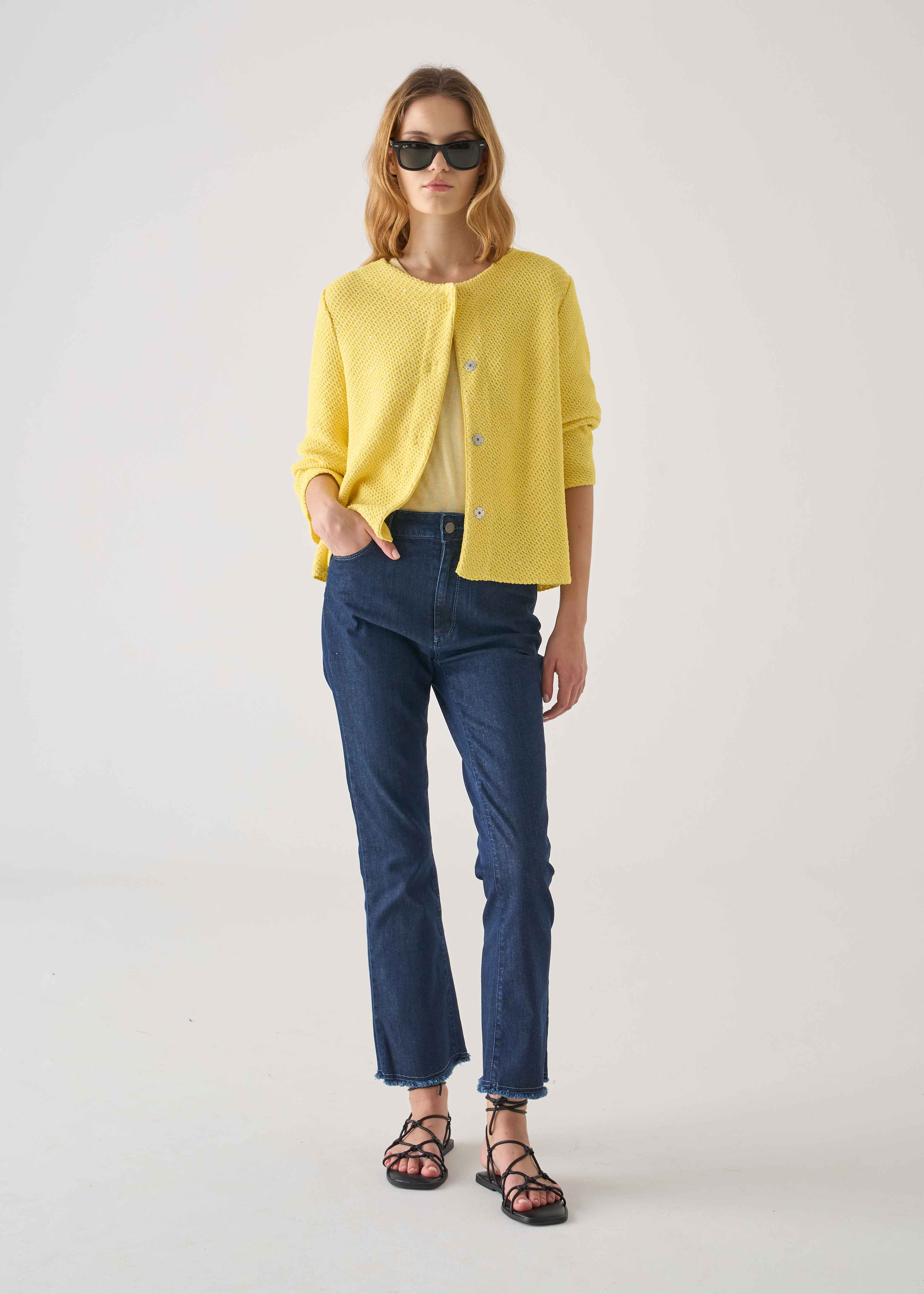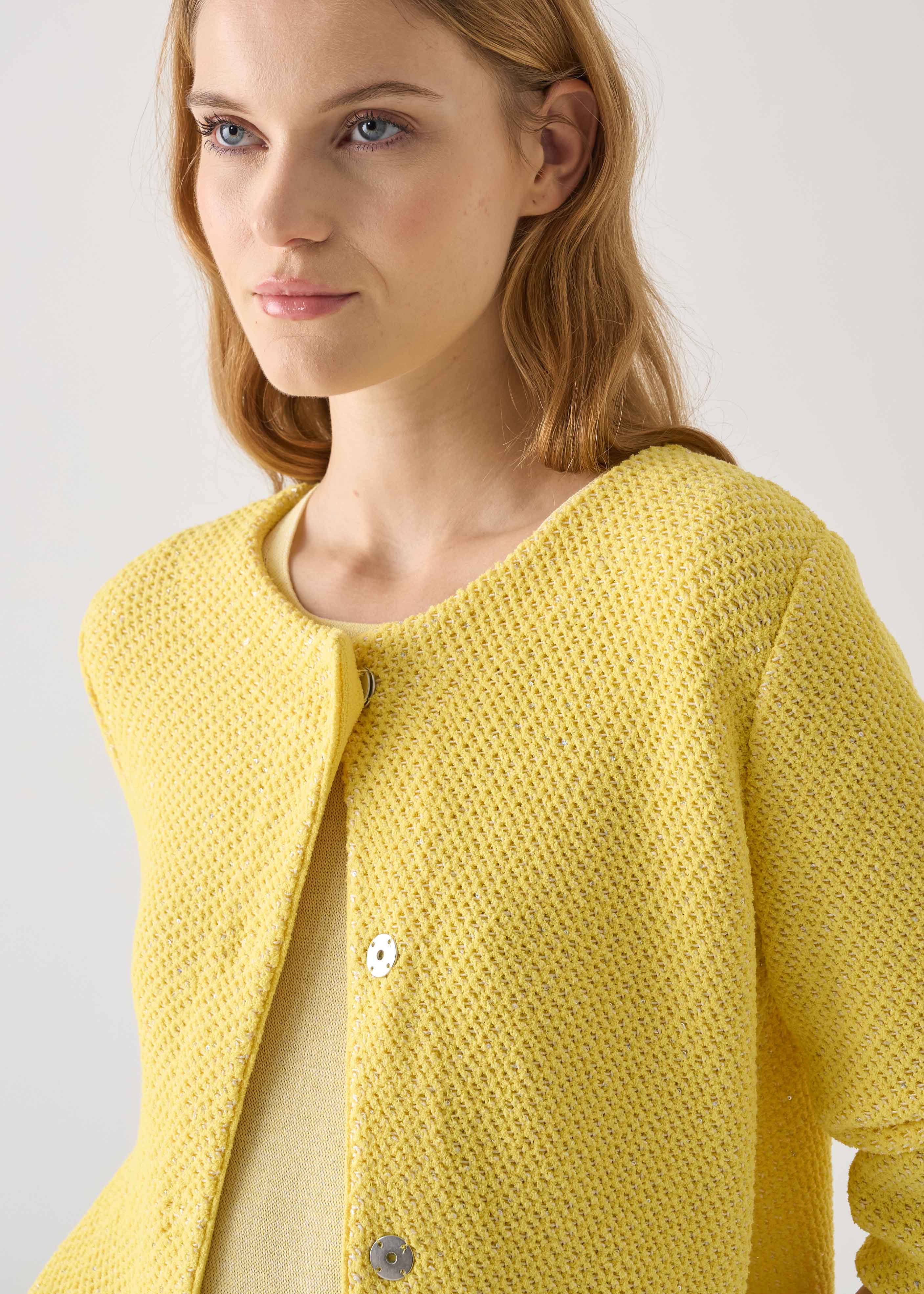 Chanel in fantasia di maglia bouclé con paillettes, caratterizzata da un intreccio di più fili con delicate micro-paillettes. Questa sofisticata lavorazione crea un gioco di luci e riflessi che dona profondità e movimento alla superficie del capo, esprimendo un lusso discreto e moderno. Il collo girocollo e la vestibilità regular mantengono la classica eleganza della chanel, mentre la pratica chiusura frontale esprime funzionalità e praticità. L’intreccio multi-filo e le micro-paillettes testimoniano la maestria artigianale italiana, creando un capo unico, disegnato e prodotto in Italia. La modella indossa la taglia 42.