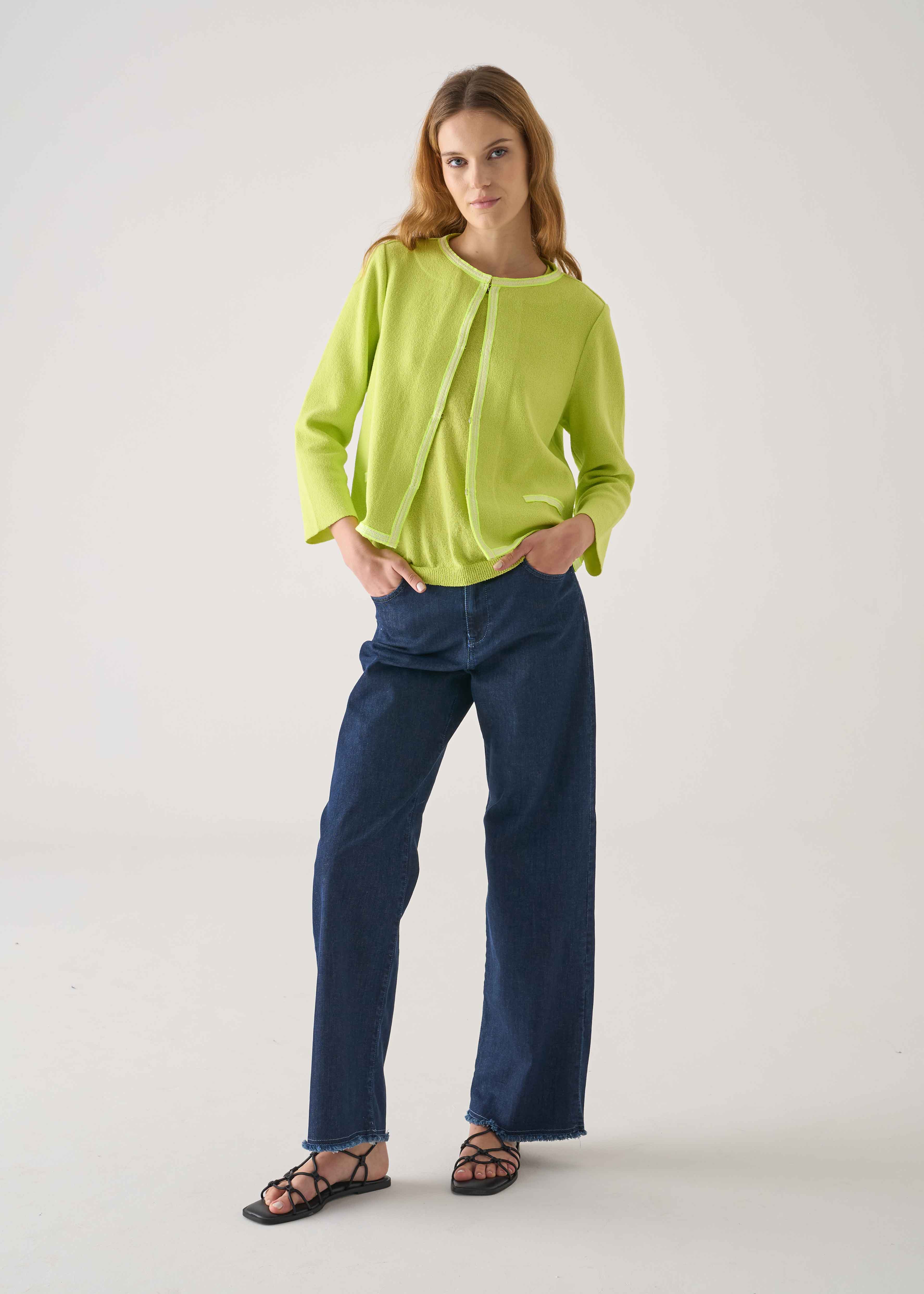 Chanel in maglia double effetto spugna, caratterizzata da una raffinata passamaneria tagliata e applicata successivamente al capo. L’elegante contrasto cromatico definisce i contorni con precisione artigianale. La stessa passamaneria viene utilizzata per le due pattine nella parte frontale, creando un design coerente e armonioso. La maglia double con effetto spugna offre una texture unica e piacevole al tatto, mentre la pratica chiusura frontale con gancetti garantisce funzionalità e stile. Questa chanel è un capo che testimonia l’attenzione ai dettagli tipica della tradizione italiana, disegnato e prodotto in Italia. La modella indossa la taglia 42.