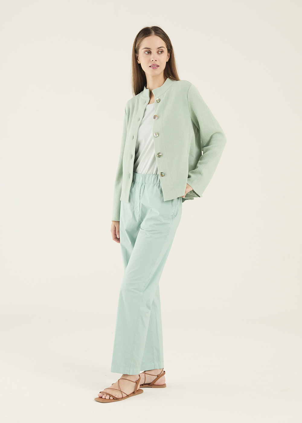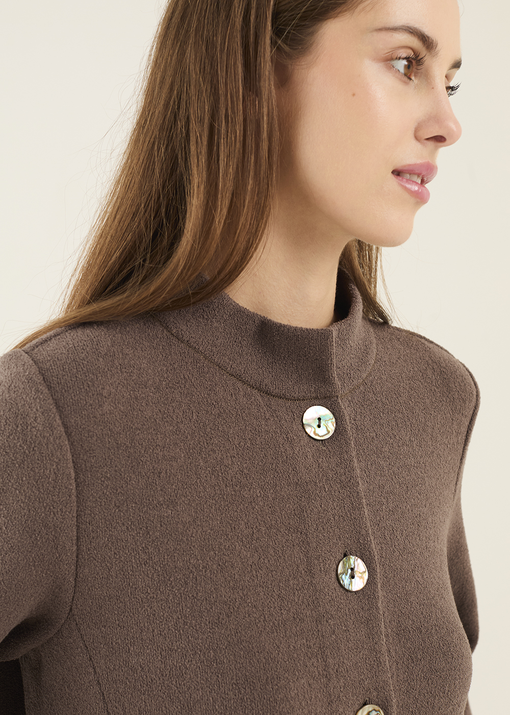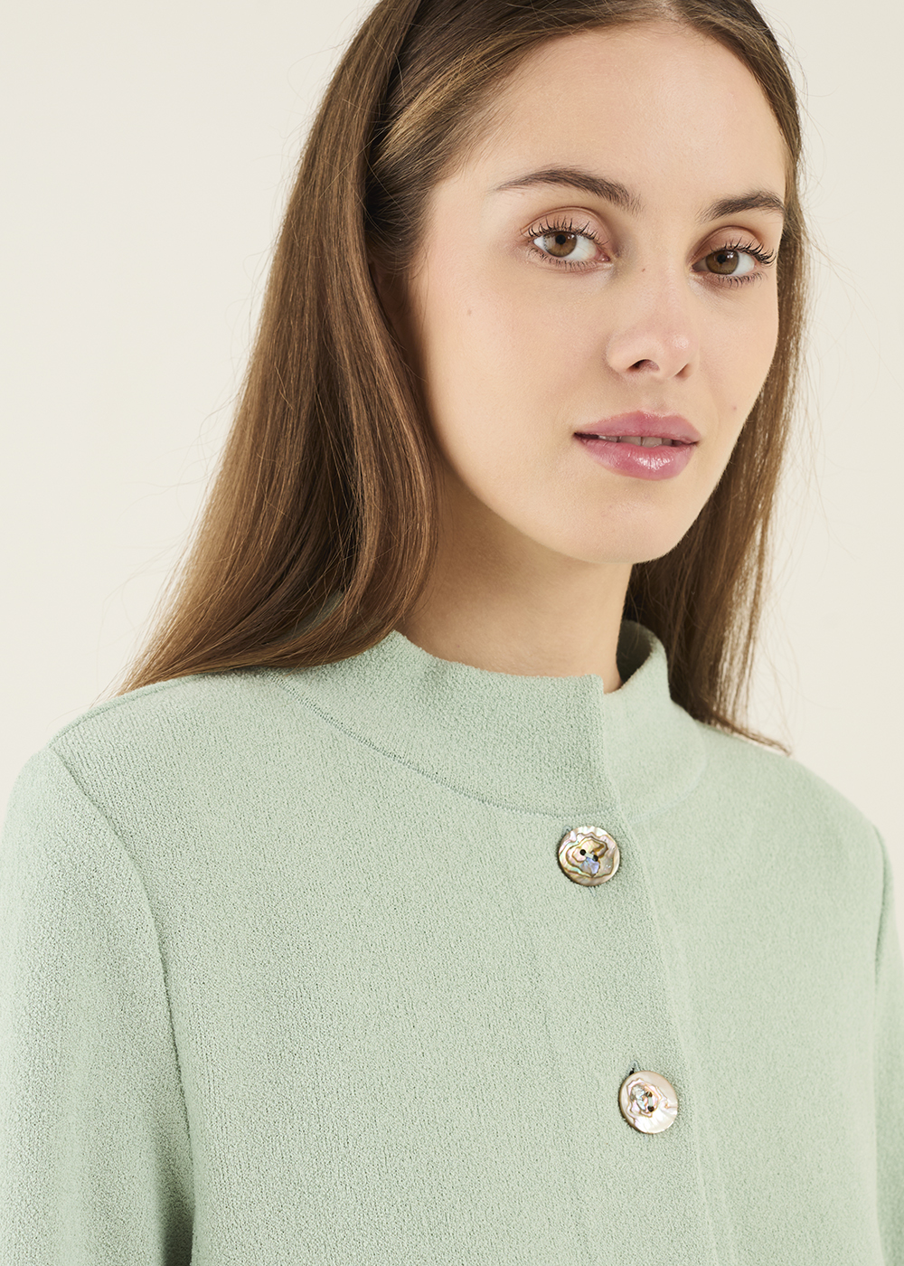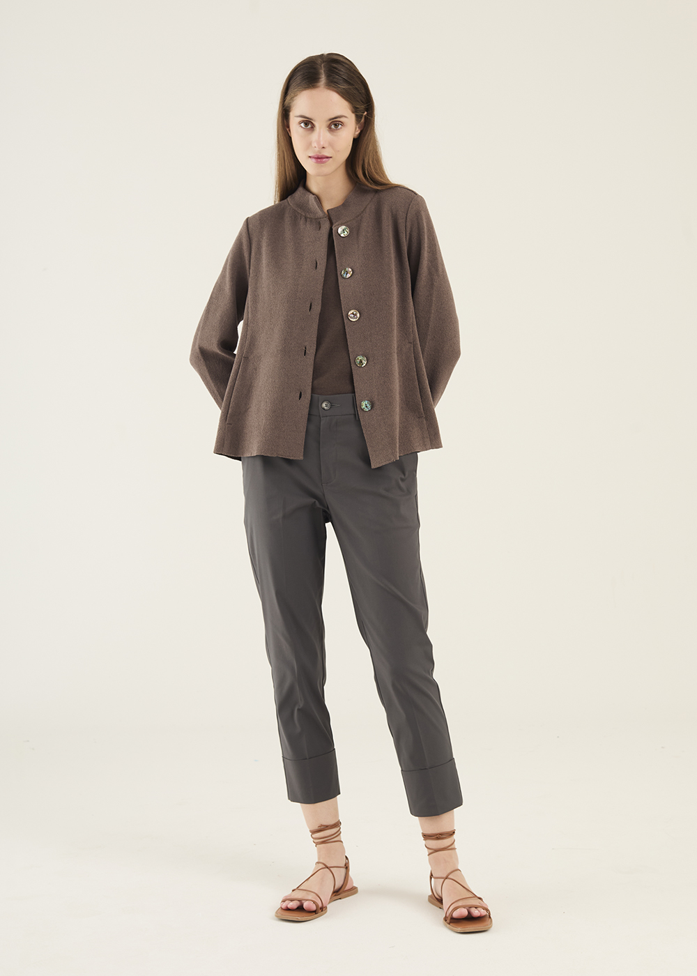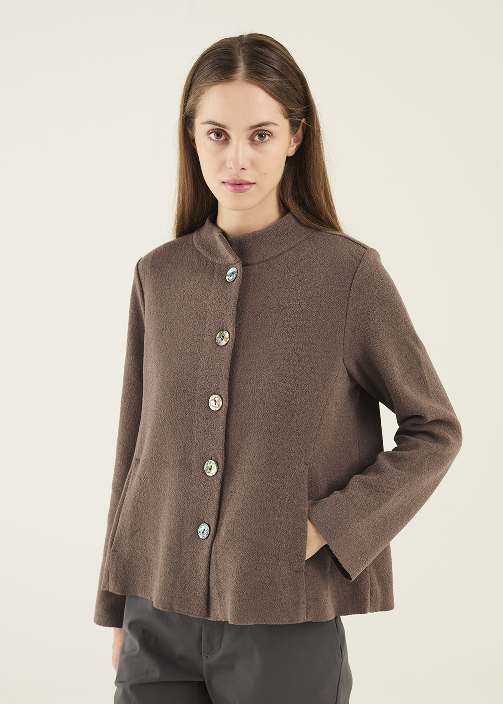 Giacca ad A in maglia double effetto spugna dall’eleganza contemporanea, caratterizzata da una silhouette svasata che scende morbida dalla spalla creando una linea femminile e armoniosa. Il colletto strutturato dona carattere e raffinatezza al design, incorniciando il viso con eleganza mentre la chiusura frontale con bottoni a vista aggiunge un dettaglio sartoriale di pregio. Due pratiche tasche laterali completano la funzionalità del capo, unendo comfort e stile. La maglia double con effetto spugna crea una texture ricca, morbida al tatto e piacevolmente avvolgente. La vestibilità ad A valorizza la figura, rendendo questa giacca perfetta per molteplici occasioni, dal casual all’elegante. Un capo versatile che esprime l’eccellenza della maglieria italiana con un design pulito e moderno. La modella indossa la taglia 42.
