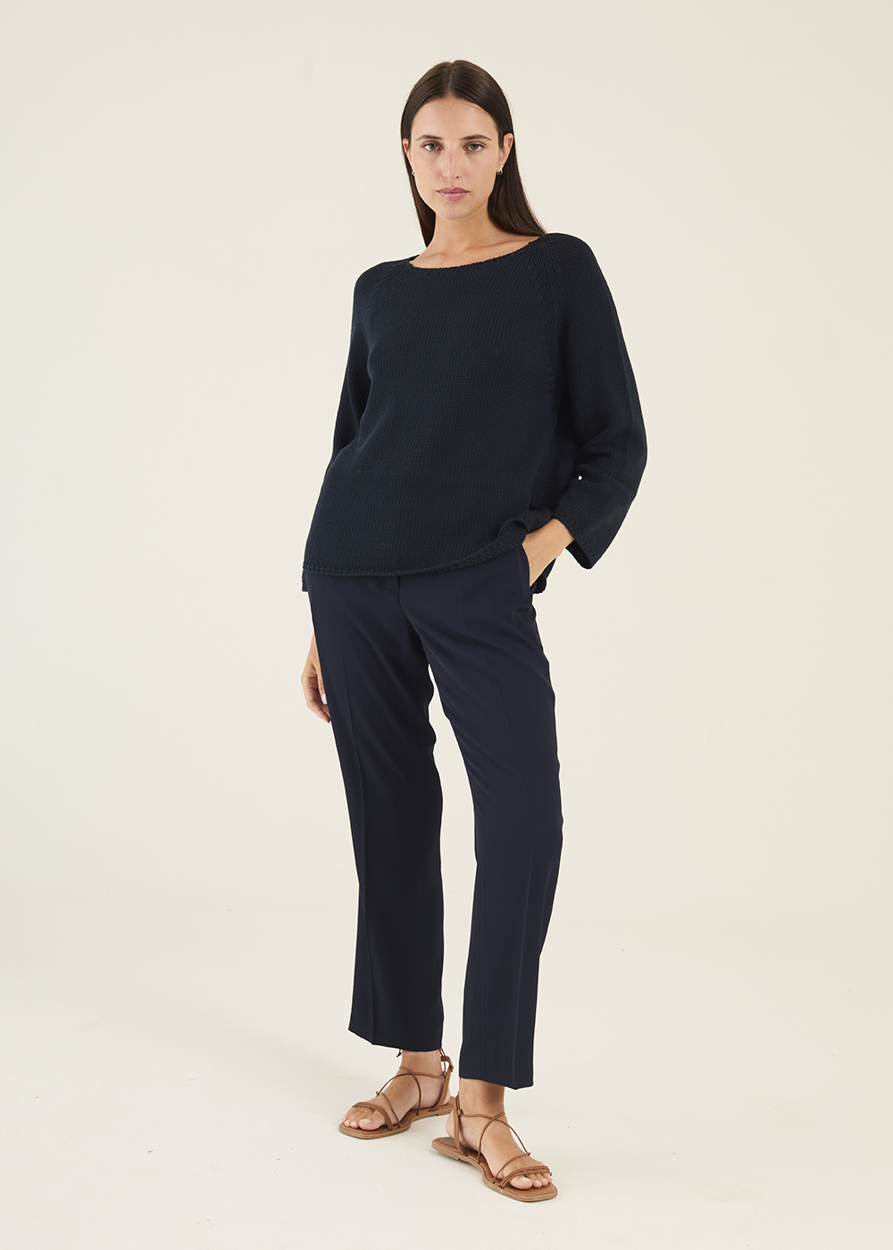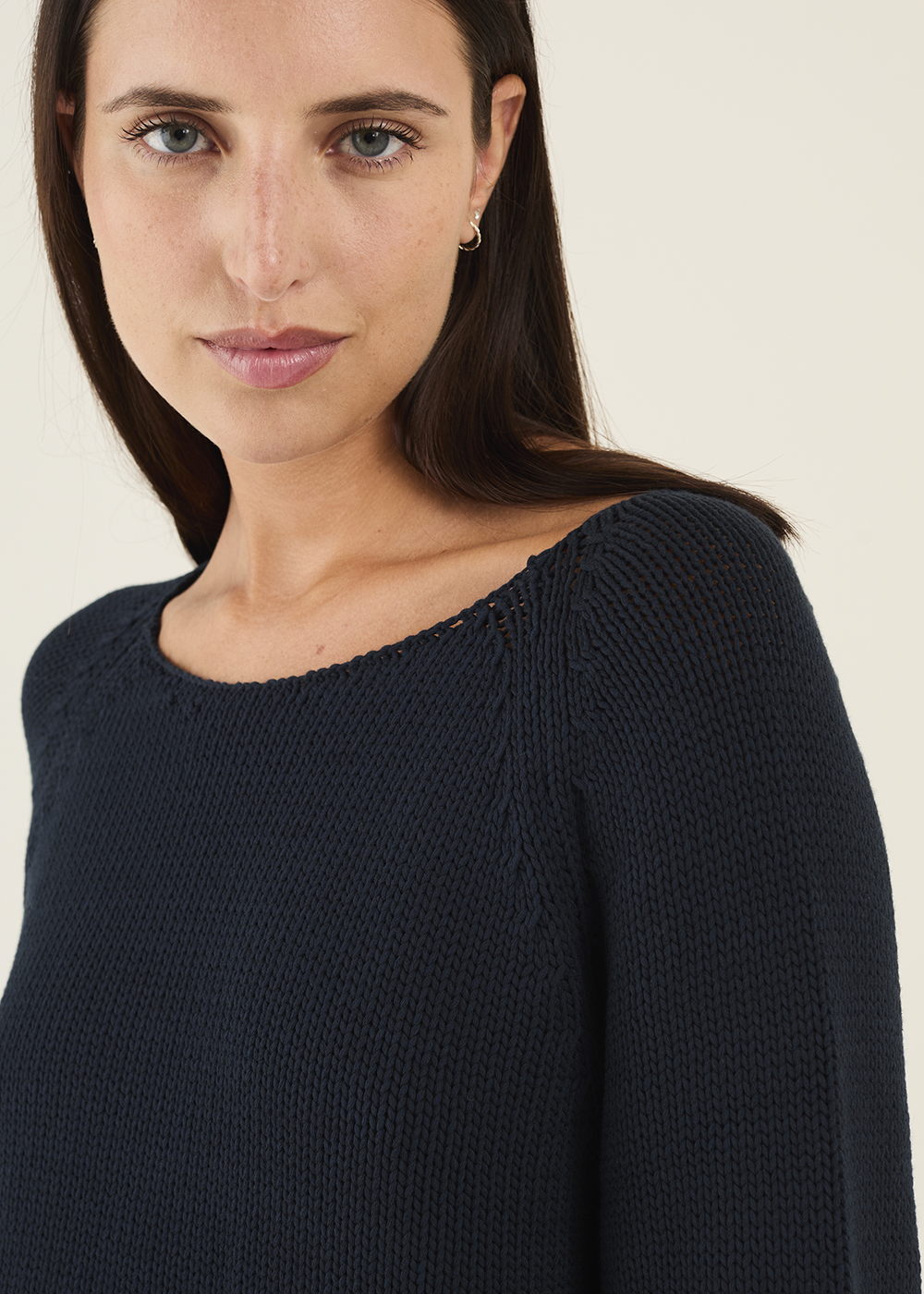 Maglia barchetta peso nuvola in misto cotone che conquista per la sua naturale eleganza e per quella sensazione di freschezza che si percepisce al primo contatto con la pelle. La lavorazione scarto ago diventa protagonista silenziosa del capo: una tecnica raffinata che crea un effetto mosso e leggermente irregolare, donando profondità e movimento alla superficie della maglia. Un dettaglio che non è mai eccessivo, ma che si rivela con eleganza, rendendo ogni capo unico e ricco di personalità. Lo scollo a barchetta regala una silhouette naturale e disinvolta. Un capo pensato per chi ama sentirsi libera, senza rinunciare a un’eleganza autentica e contemporanea. Disegnato e prodotto interamente in Italia, rappresenta l’essenza del Made in Italy più raffinato. La modella indossa la taglia 42.