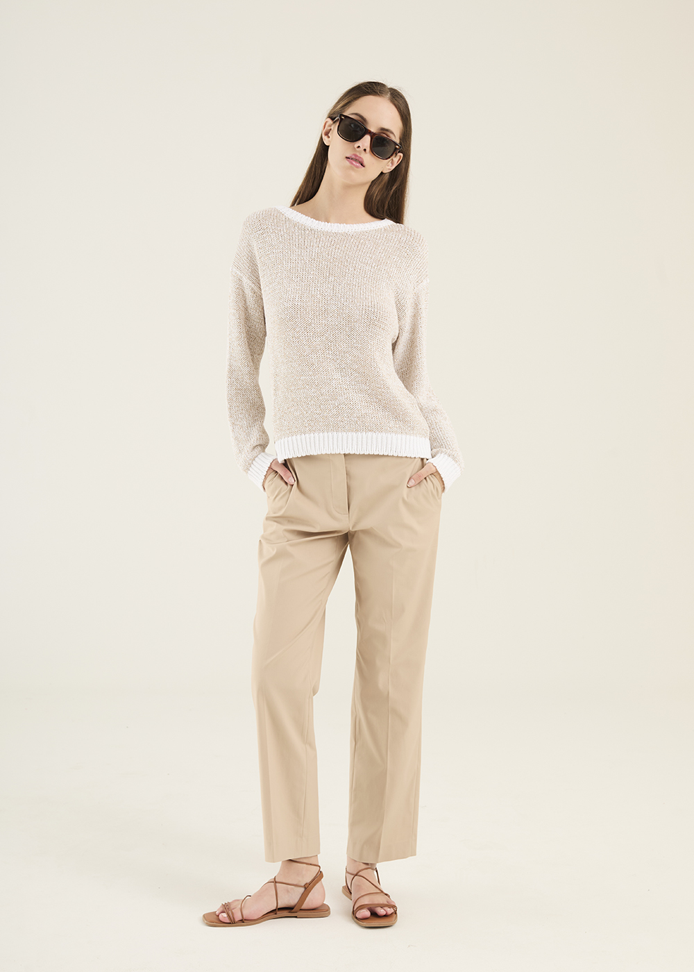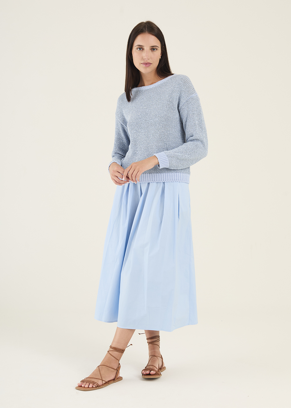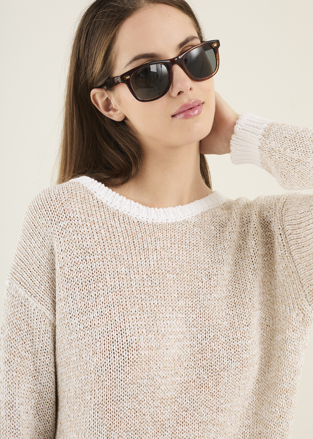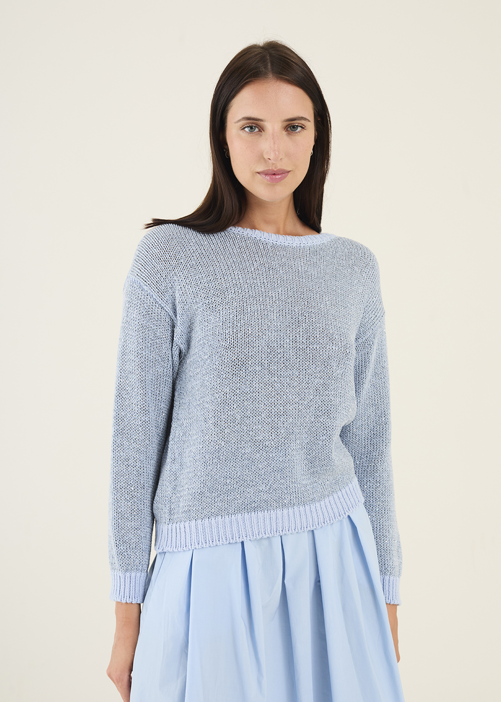 Maglia girocollo con paillettes e bordo a contrasto realizzata in cotone vanisè, che si distingue per una texture fresca e leggera, perfetta per accompagnare con eleganza le mezze stagioni e le serate estive più fresche. La vestibilità morbida spalla scesa avvolge il corpo con naturalezza, senza segnare, creando una silhouette fluida e disinvolta. Il girocollo, pulito e raffinato, incornicia il viso con delicatezza, mentre le maniche lunghe aggiungono equilibrio e versatilità al design. A rendere il capo unico è il gioco di dettagli: le paillettes, distribuite con misura, catturano la luce e donano luminosità senza eccessi, aggiungendo un tocco sofisticato e femminile. I bordi a contrasto definiscono la linea con decisione, creando un equilibrio visivo che valorizza la struttura della maglia e ne esalta il carattere moderno. Un capo pensato per chi ama distinguersi con discrezione, perfetto per elevare anche i look più semplici con un accento luminoso e ricercato. Disegnata e prodotta interamente in Italia, rappresenta l’incontro tra qualità e stile Made in Italy. La modella indossa la taglia 42.
