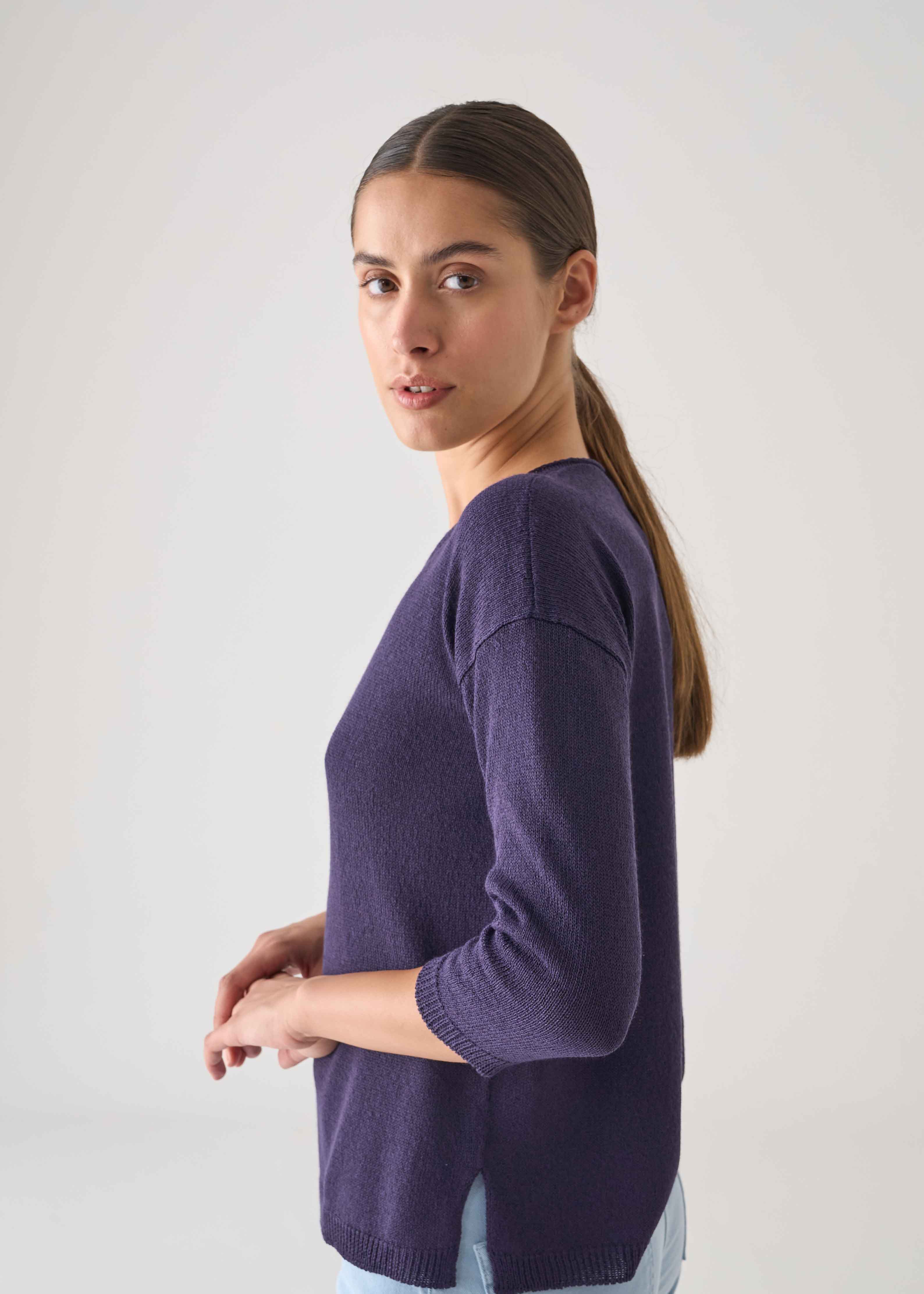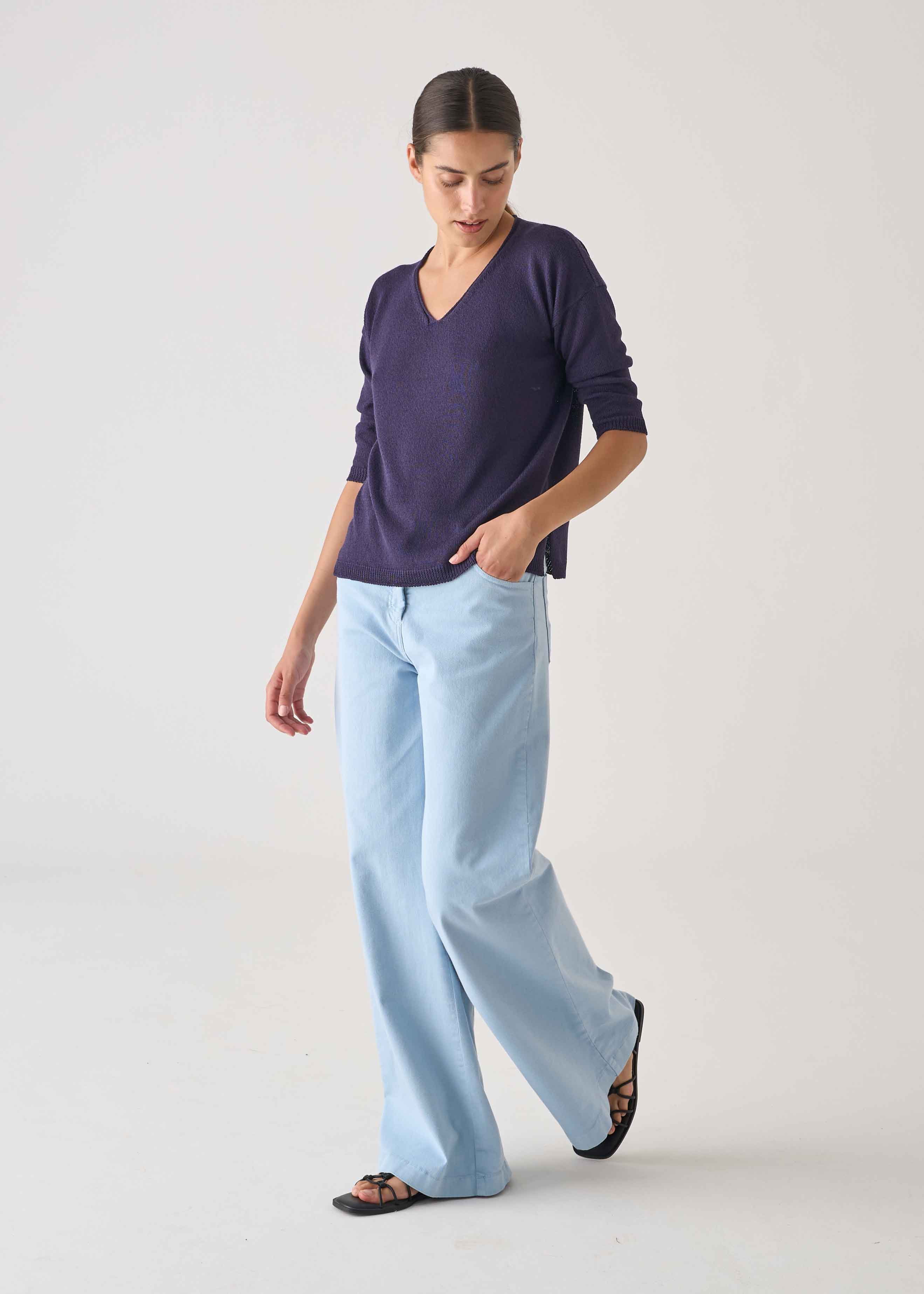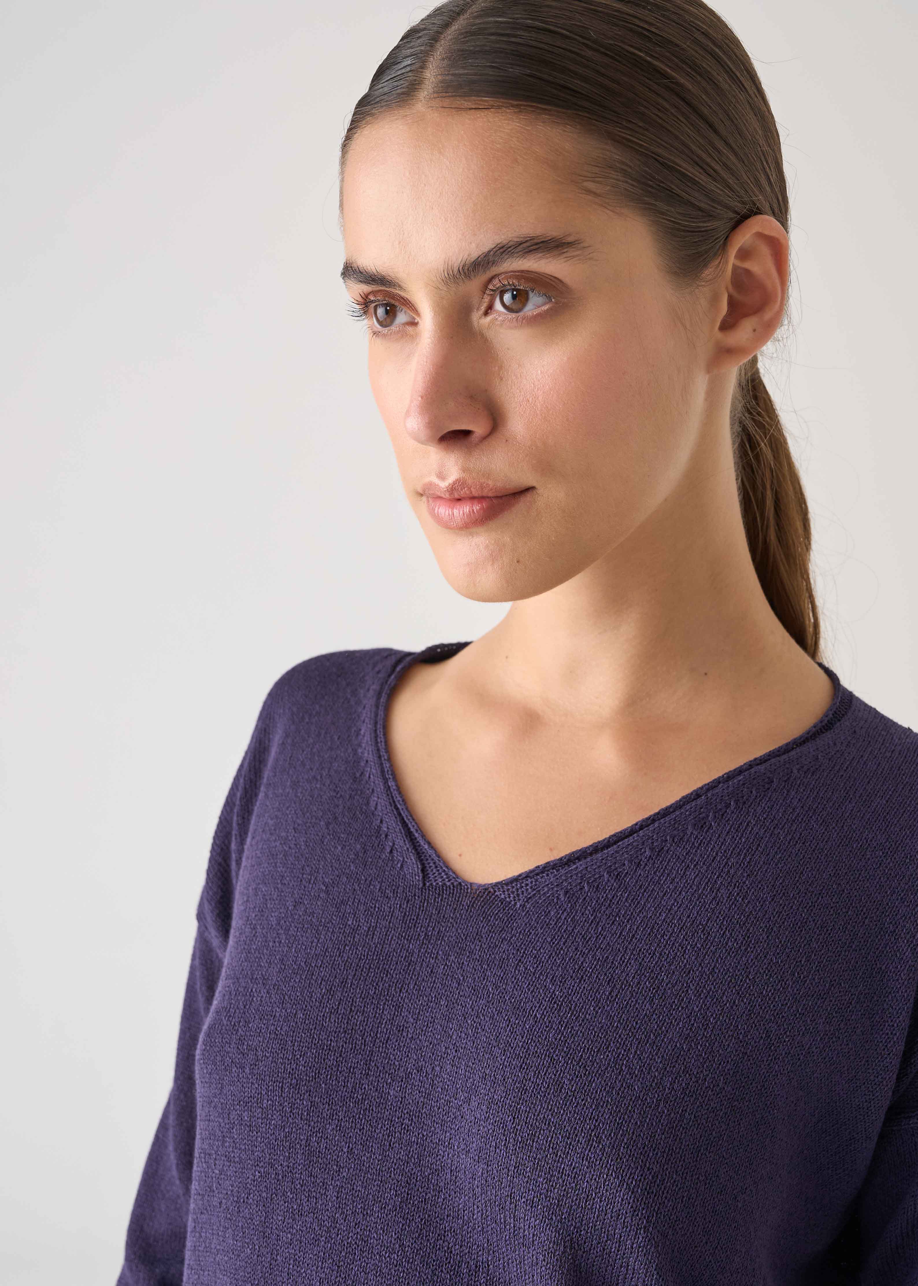 Maglia con scollo V in viscosa wet effect, dalla vestibilità rilassata e femminile, caratterizzata da comodi spacchetti laterali all’altezza dei fianchi. Lo scollo V presenta una lavorazione con calati a vista che crea un effetto chic, in armonia con i bordi a coste presenti su maniche e fondo che aggiungono eleganza al capo. Una maglia versatile e confortevole, disegnata e prodotta in Italia con cura e attenzione ai dettagli. La modella indossa la taglia 42.