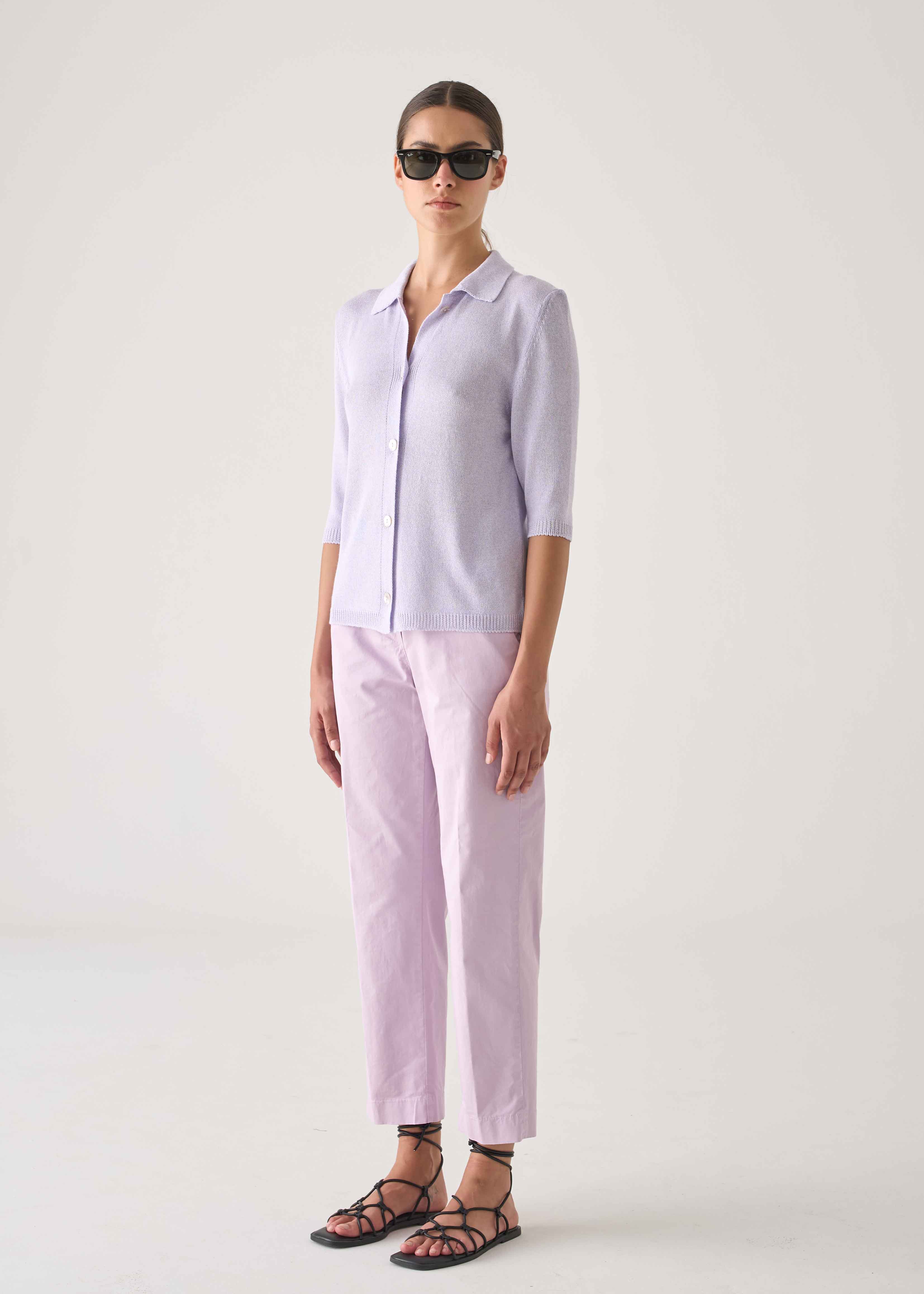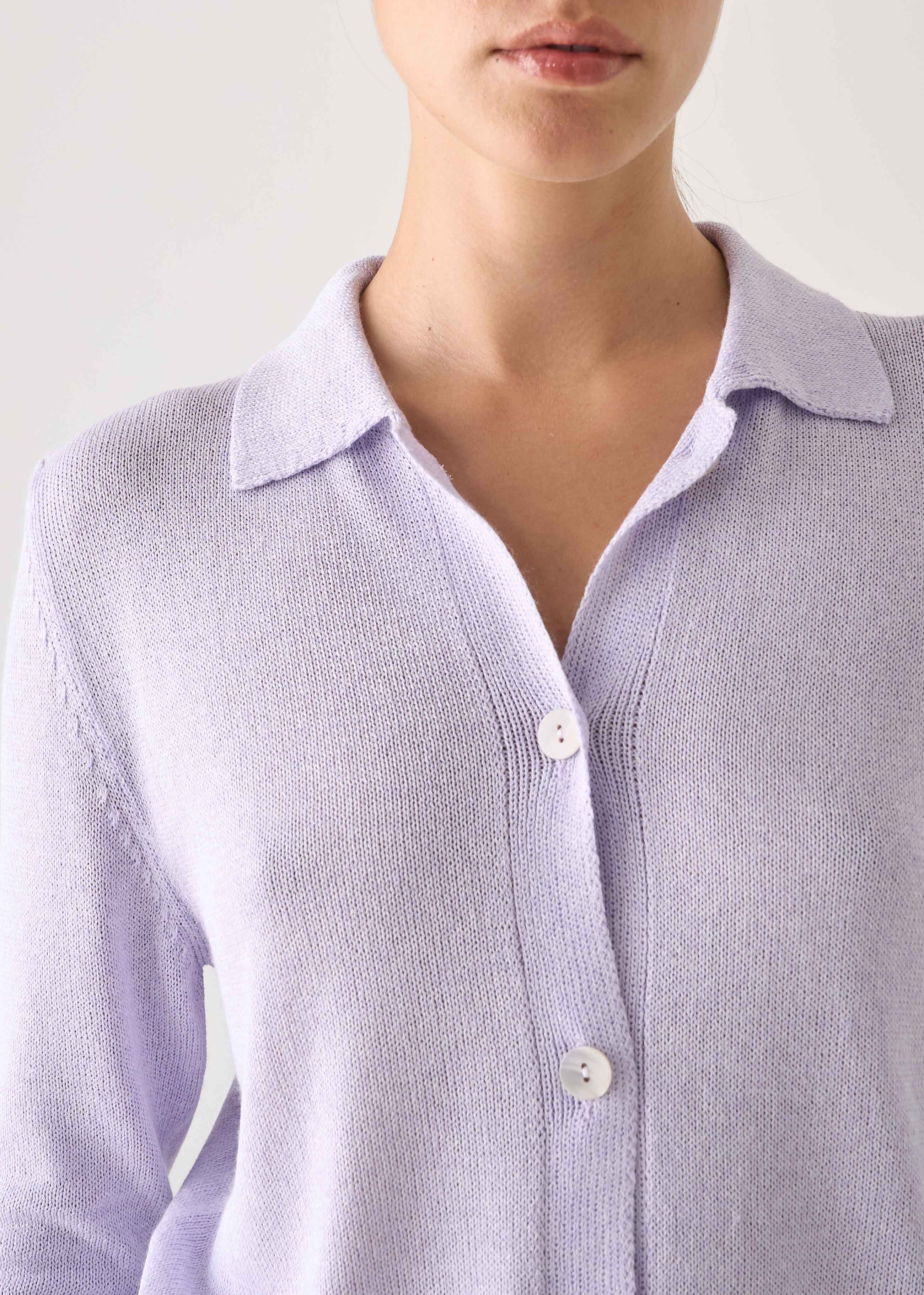 Polo in maglia di viscosa, caratterizzata da maniche al gomito per un look elegante e casual. La chiusura con bottoni e il colletto classico abbinati ai bordini finali a costine, presenti sia sulle maniche che sul fondo, conferiscono struttura e definizione al capo. Un pezzo versatile che unisce la comodità della maglia alla raffinatezza di una polo, disegnato e prodotto in Italia con processi produttivi artigianali. La modella indossa la taglia 42.