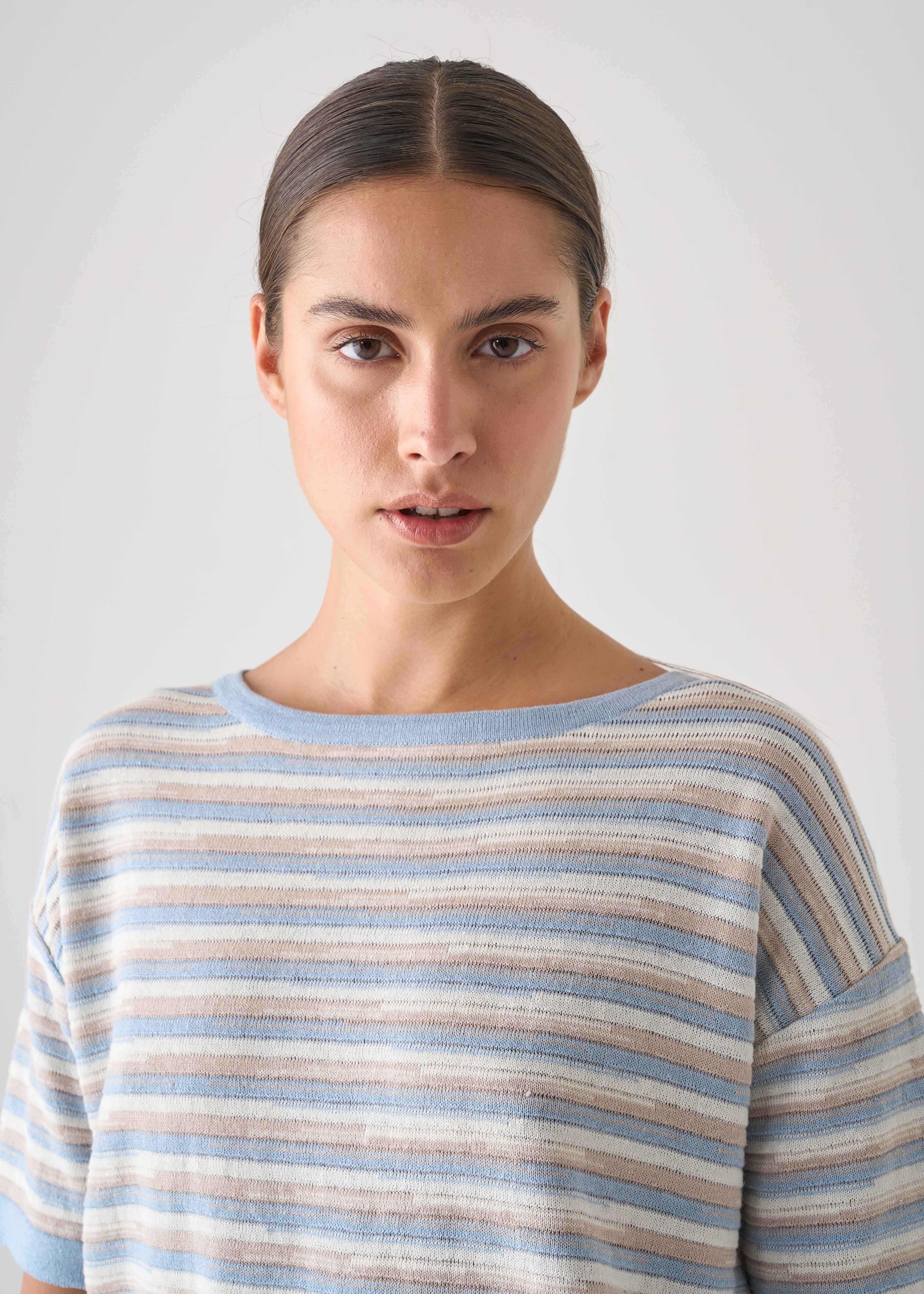 T-shirt in maglia di lino e cotone bio con delicate righe orizzontali multicolor dai toni pastello, che creano un effetto cromatico raffinato e armonioso. La leggerezza del lino e la finezza della lavorazione rendono questo capo perfetto per le calde giornate estive, offrendo freschezza e comfort. La vestibilità rilassata e i dettagli curati la trasformano in un pezzo versatile ed elegante. Un capo sofisticato che unisce naturalità e stile, disegnato e prodotto in Italia con attenzione alla qualità dei materiali. La modella indossa la taglia 42.