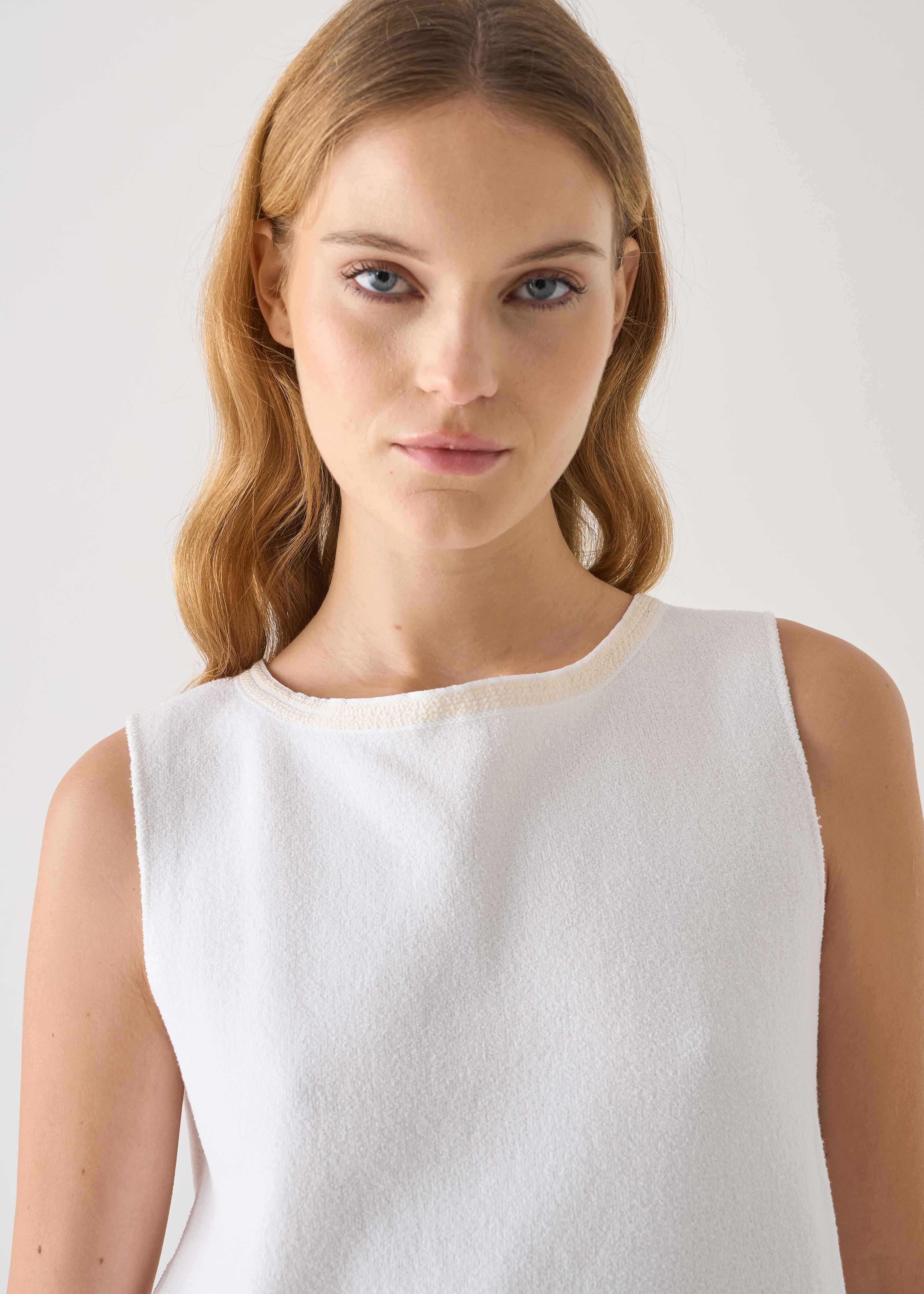 Top in maglia di cotone double effetto spugna, che regala una sensazione di morbidezza unica al contatto con la pelle. Il raffinato dettaglio dello scollo a barchetta è una passamaneria dal colore naturale che crea un elegante contrasto cromatico, impreziosendo il capo con un tocco di ricercatezza. Le finiture a taglio vivo su maniche e fondo conferiscono modernità e carattere, creando linee pulite e contemporanee. Un pezzo dall’eleganza discreta che unisce comfort e stile, disegnato e prodotto in Italia con cura minuziosa per ogni dettaglio. La modella indossa la taglia 42.